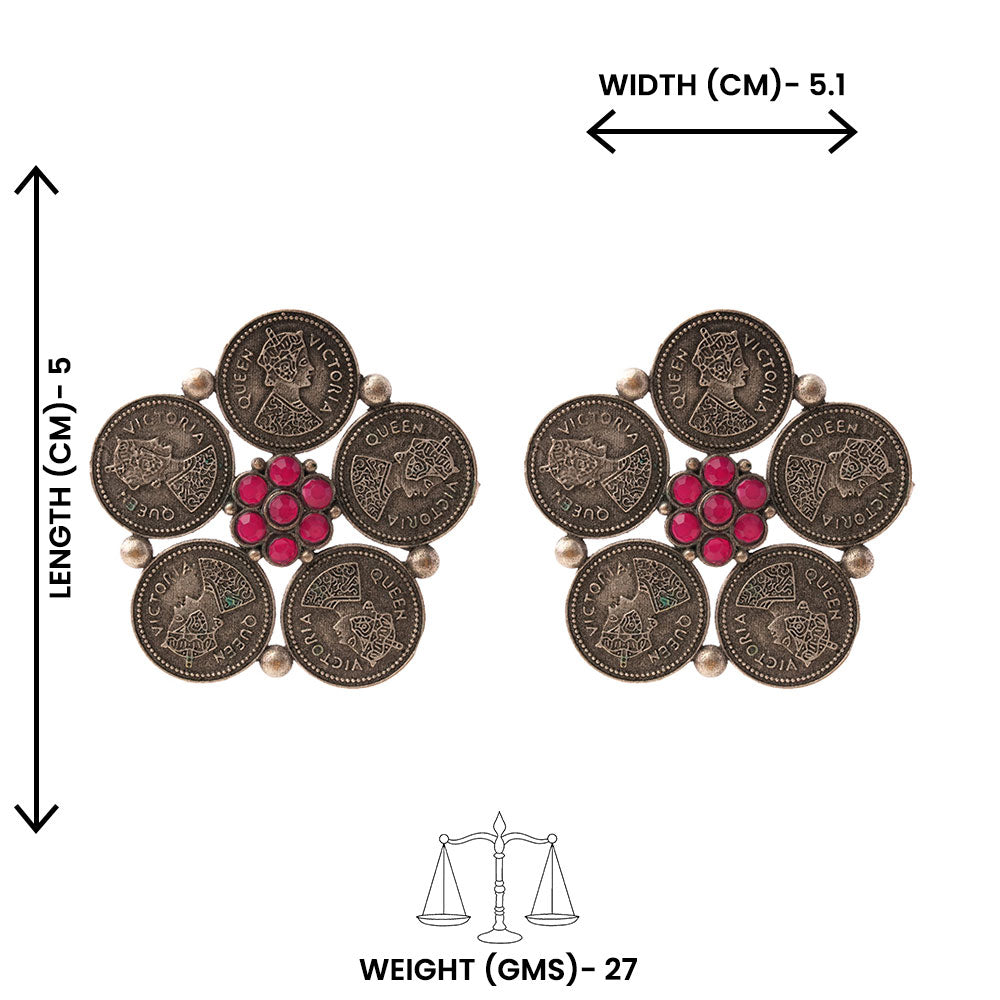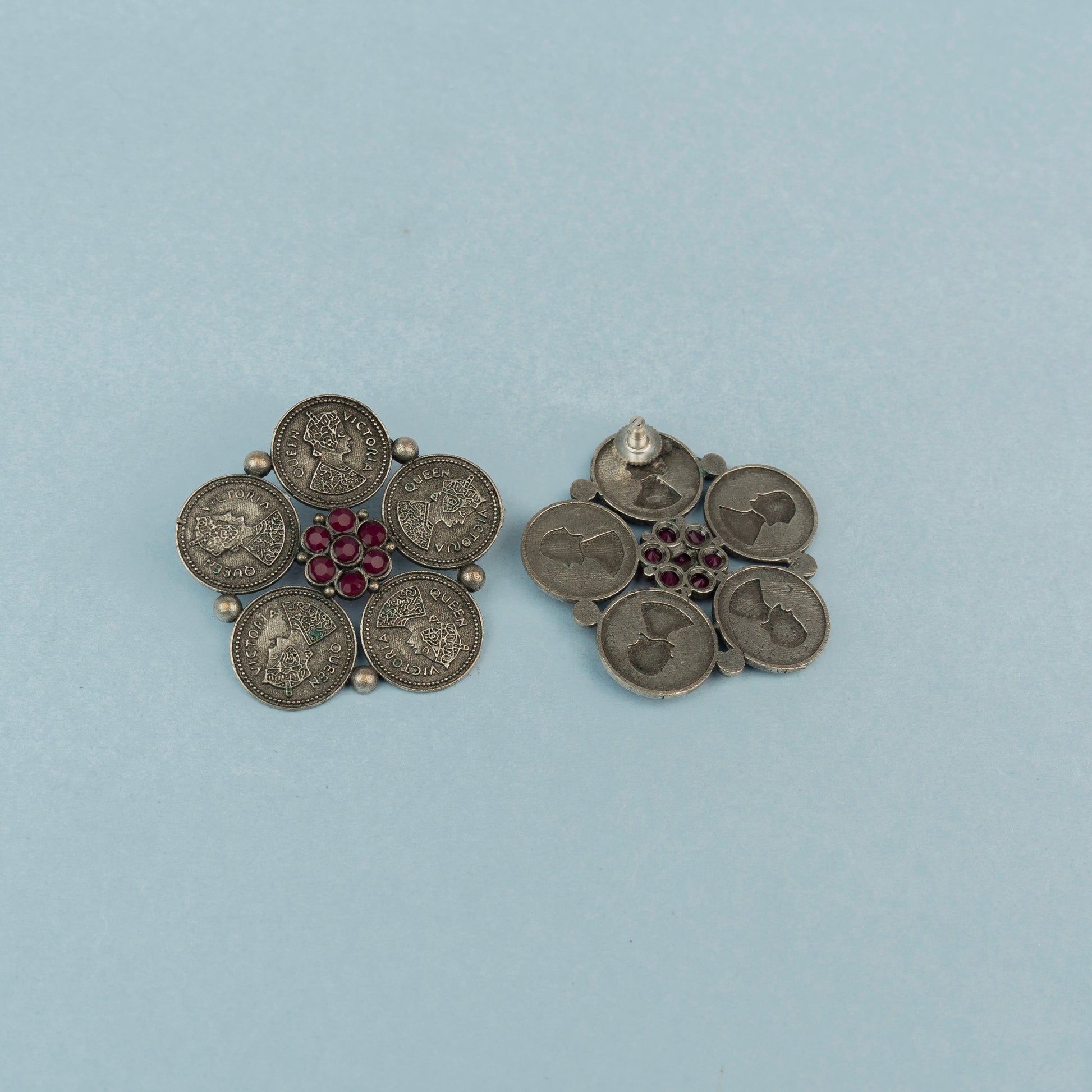 MudraPushp- Silver Brass Oxidised Stud Earrings(Red)