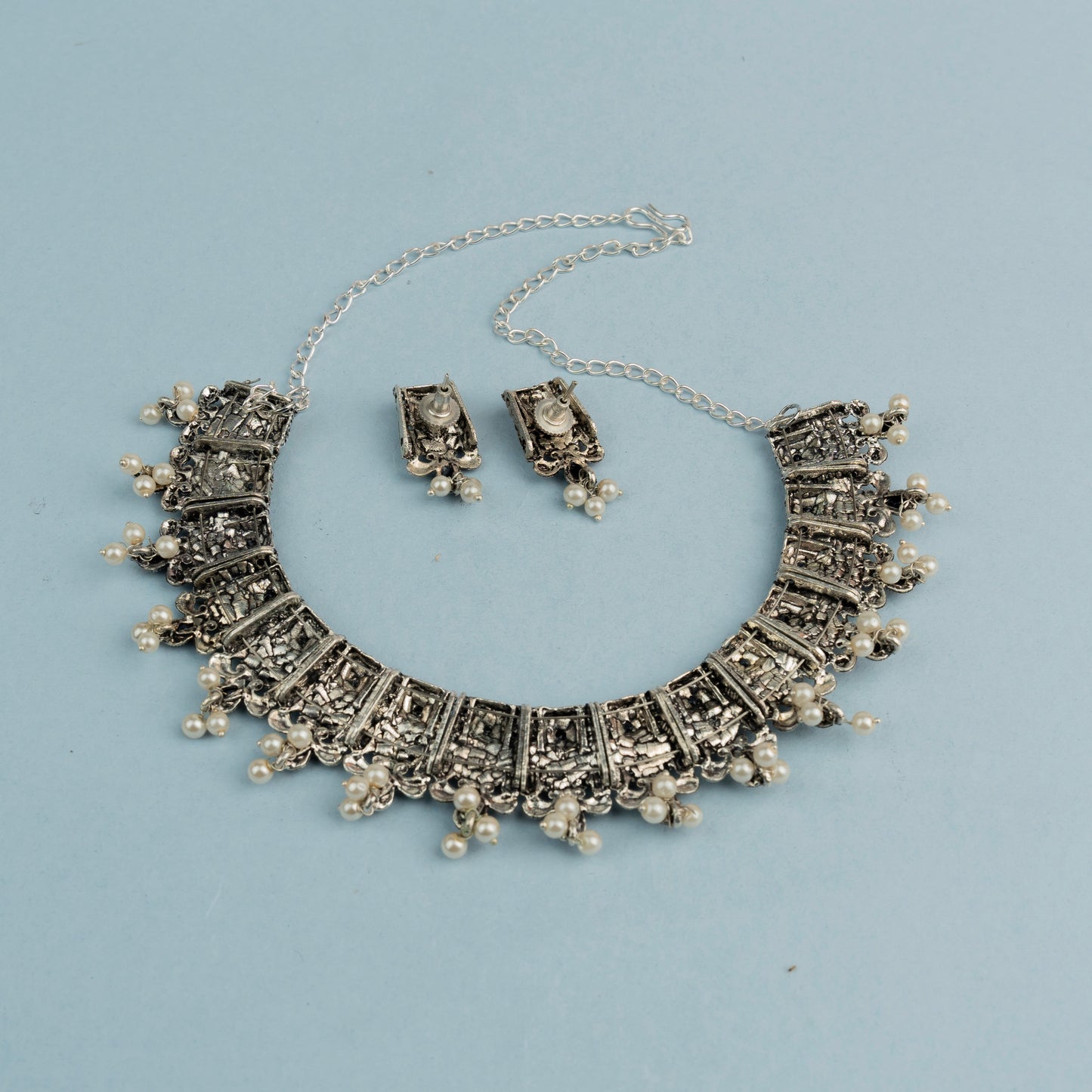 Make a statement with our black stone studded German silver neckpiece set. Bold and sophisticated, it's ideal for formal occasions and evening events.