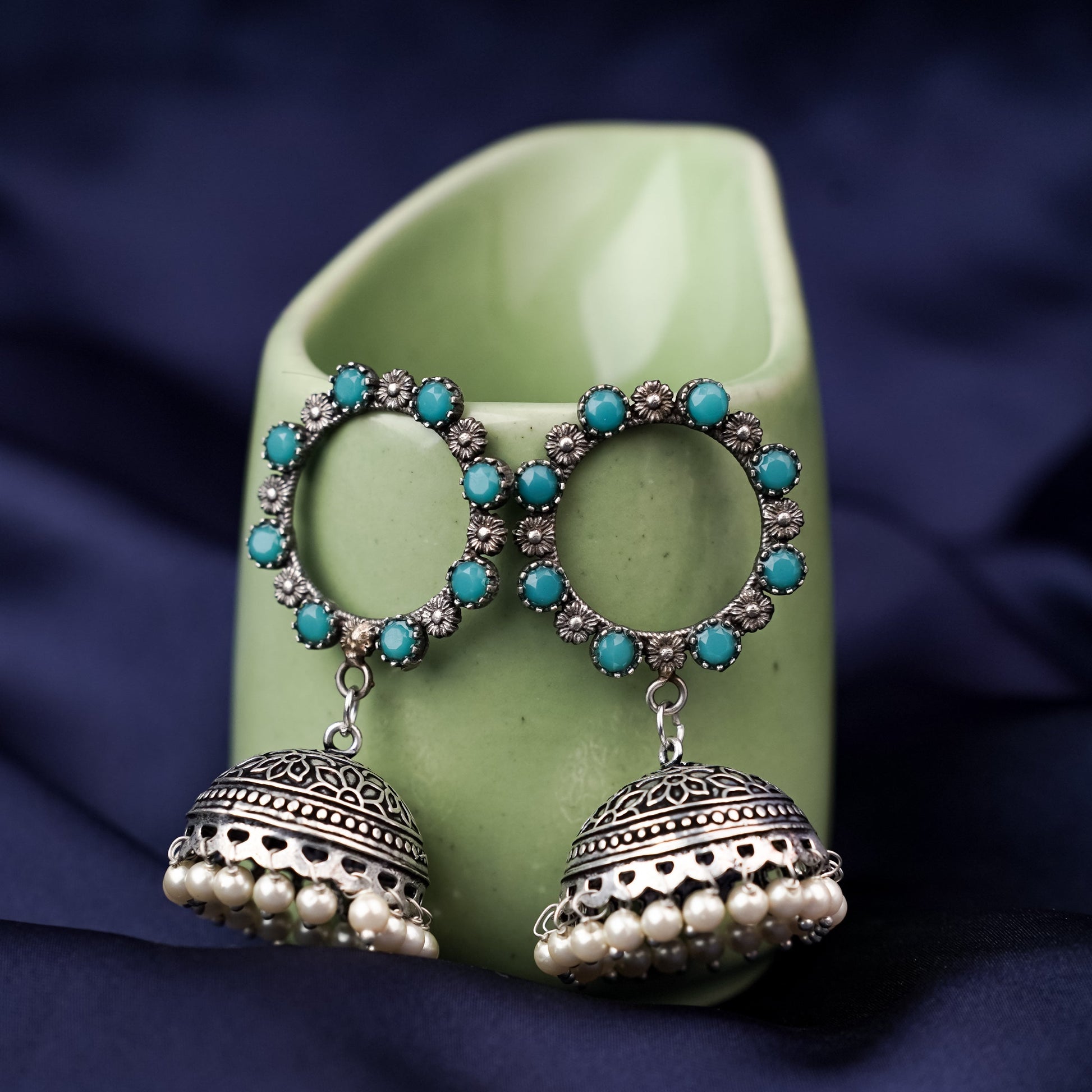 | Style Tip: Pair these pearl jhumkas with pastel sarees or kurtis to complement their sky-blue detailing. |