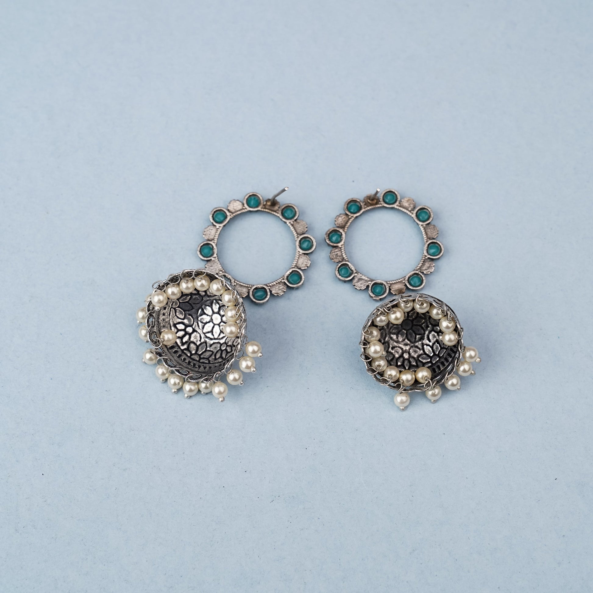 Paridhi Pearl Jhumka Earrings bring together traditional oxidised detailing and soft pearl accents. Crafted in silver-toned brass, these earrings are lightweight yet elegant—perfect for festive wear, ethnic outfits, or everyday chic styling.