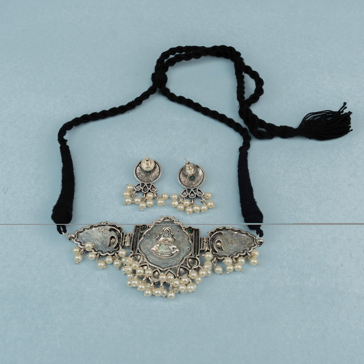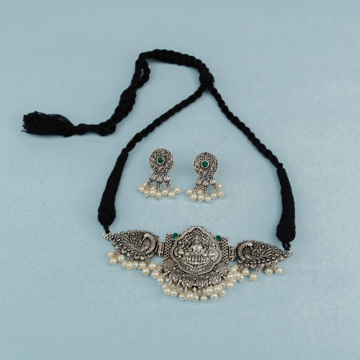 Celebrate prosperity with our green stone studded Laxmi motif German silver neckpiece set. Featuring intricate detailing and spiritual symbolism, it's ideal for festive occasions.