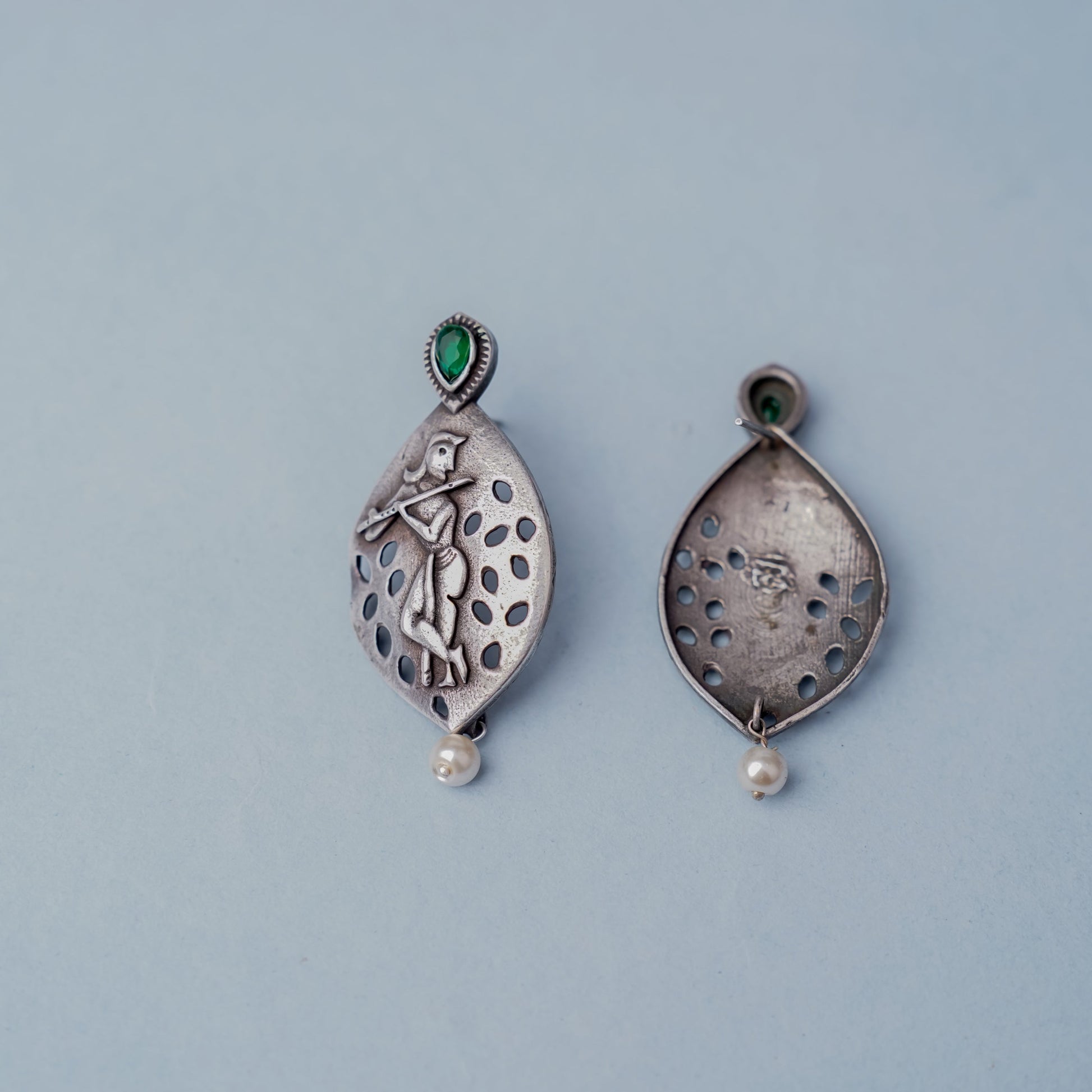 Kanha- Silver Brass Pearl dangler earrings(Green)