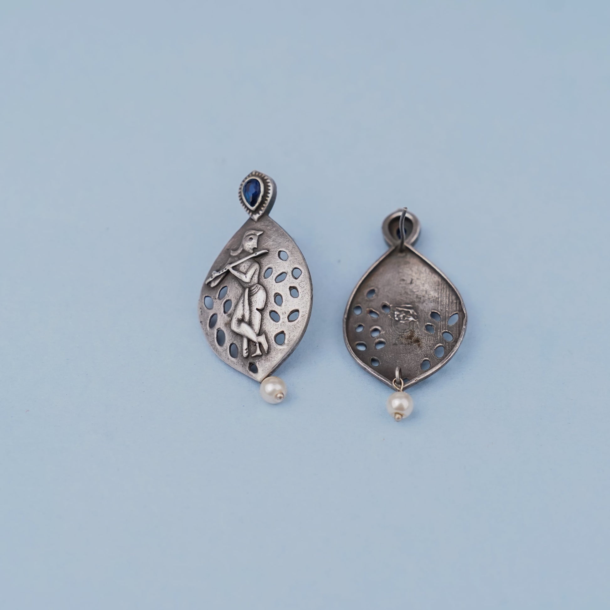 Kanha- Silver Brass Pearl dangler earrings(Blue)