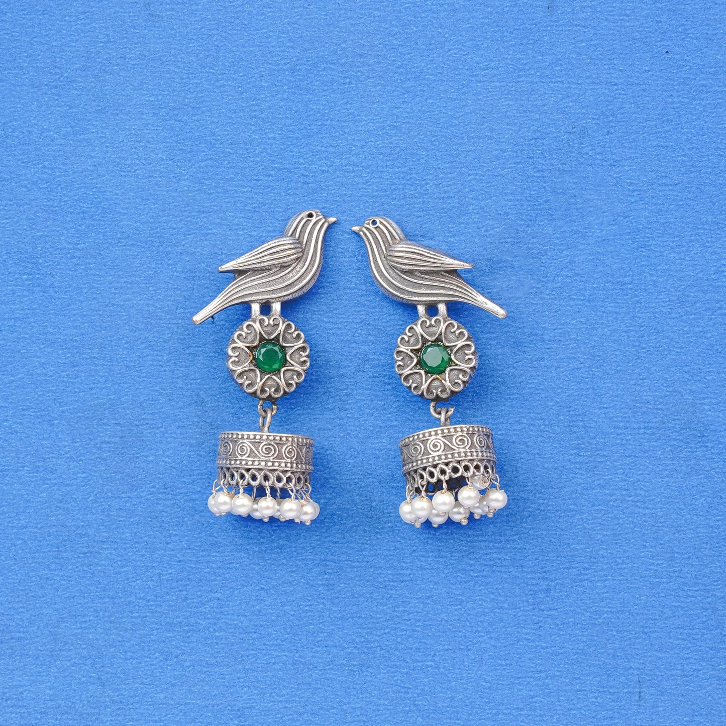 Chakori- Silver Brass Oxidised Jhumka Earrings( Green)