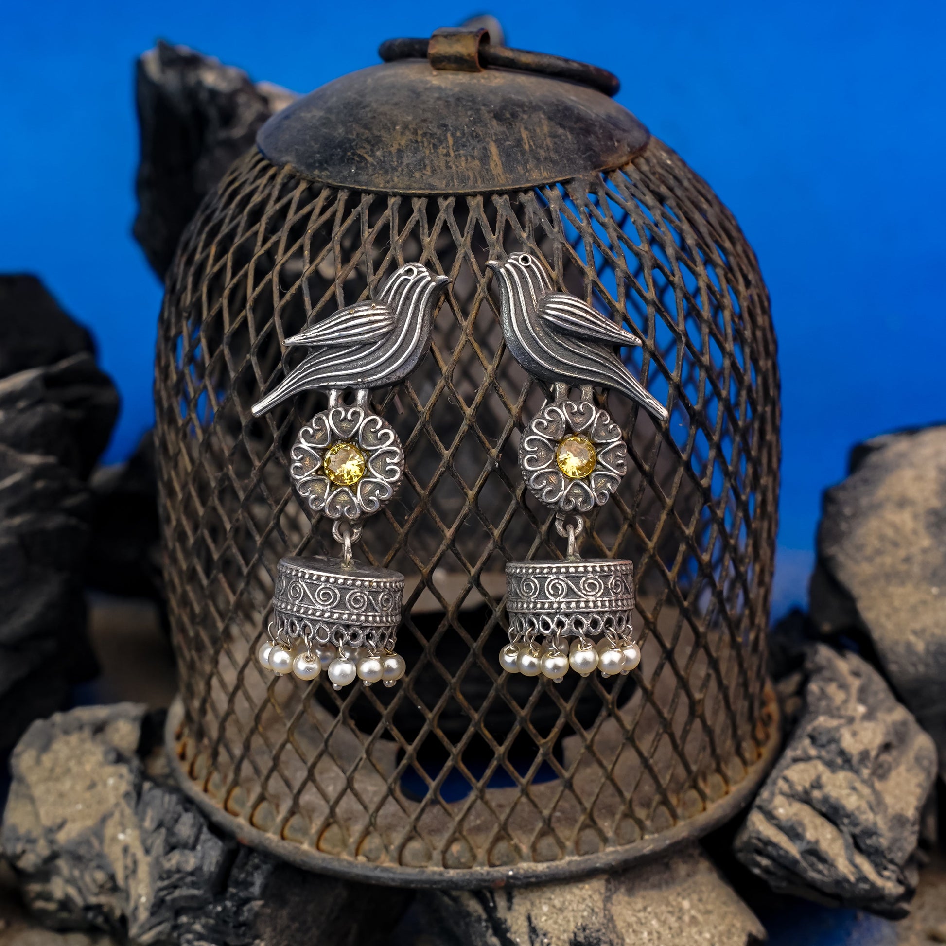 Chakori- Silver Brass Oxidised Jhumka Earrings(Yellow)