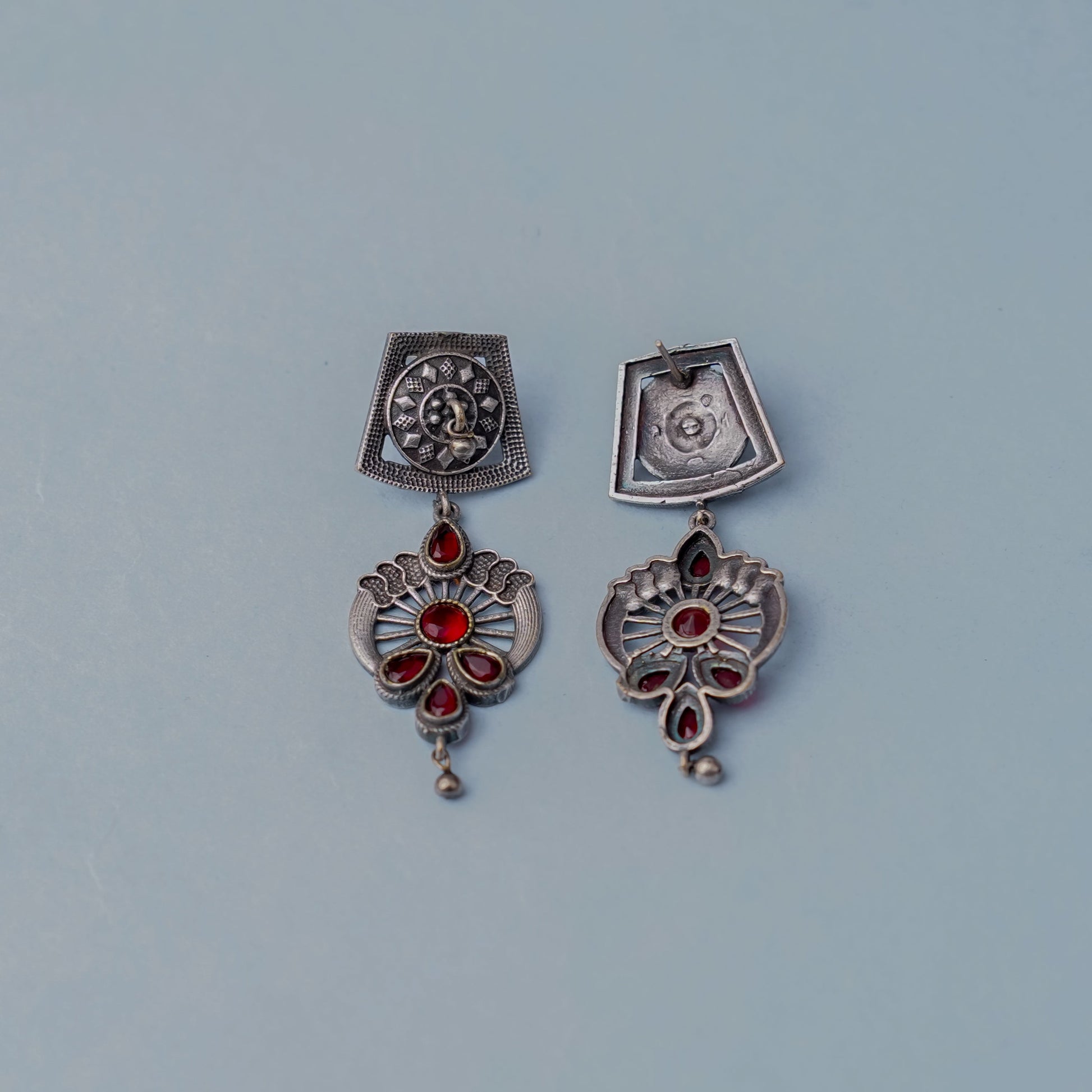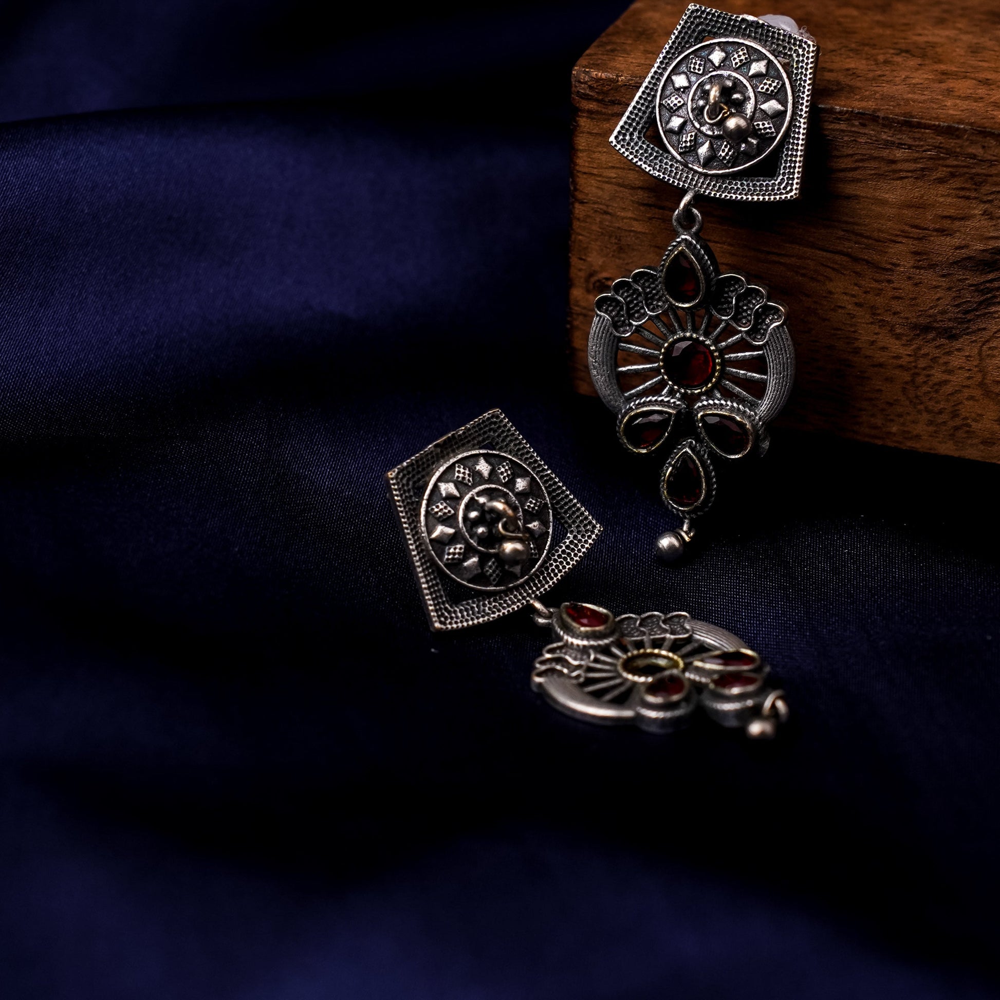 Gulbahar-Silver Brass Oxidised dangler earrings(Red)