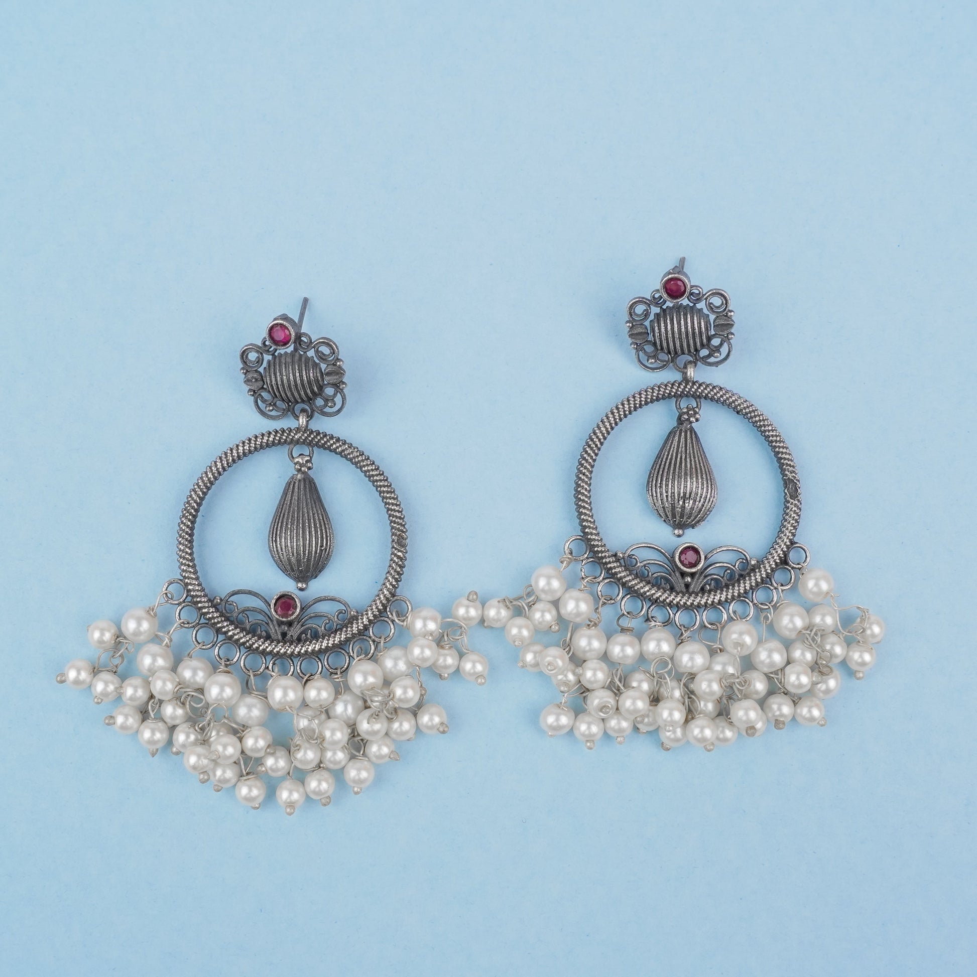 Ghoomar- Silver Brass Pearl dangler earrings(Red)