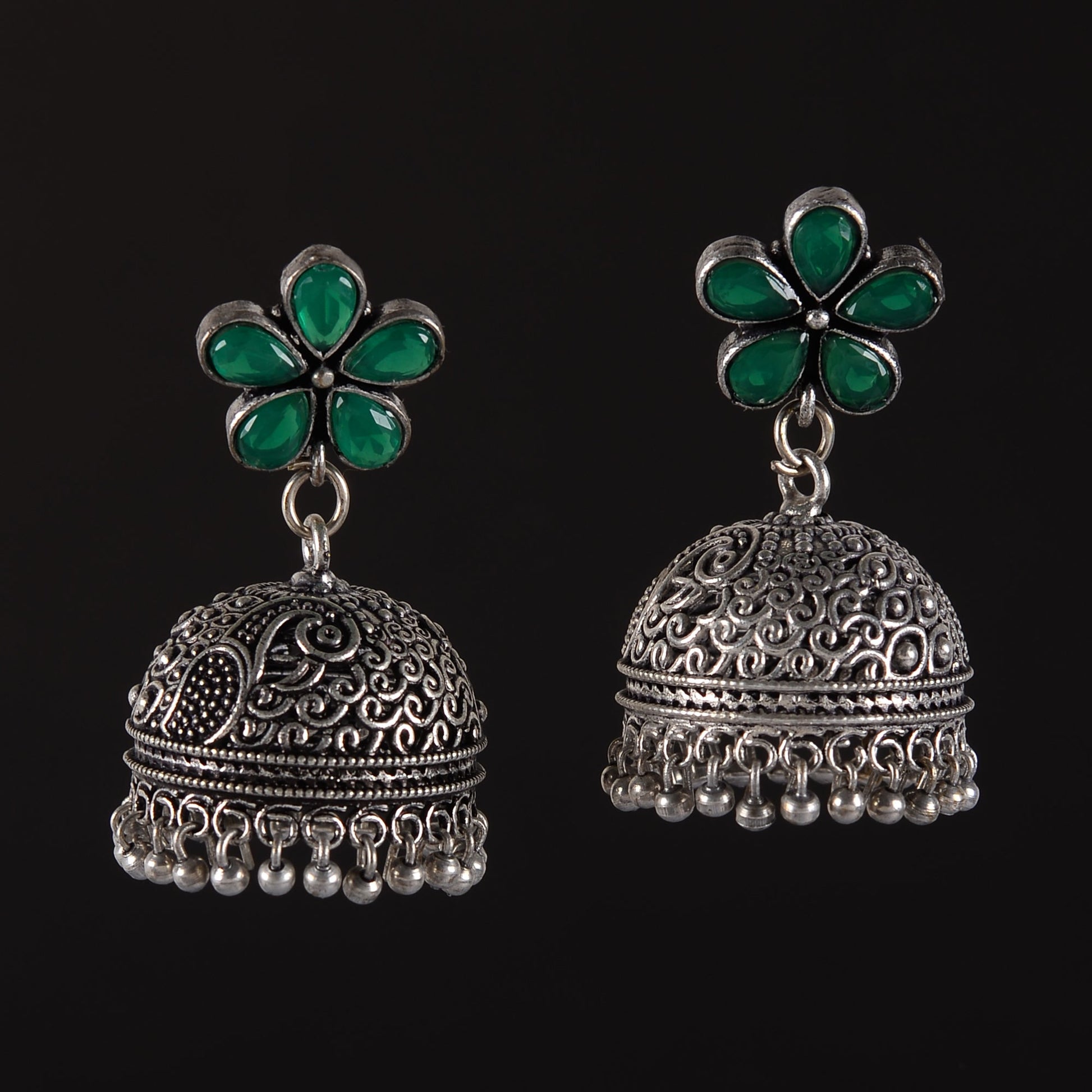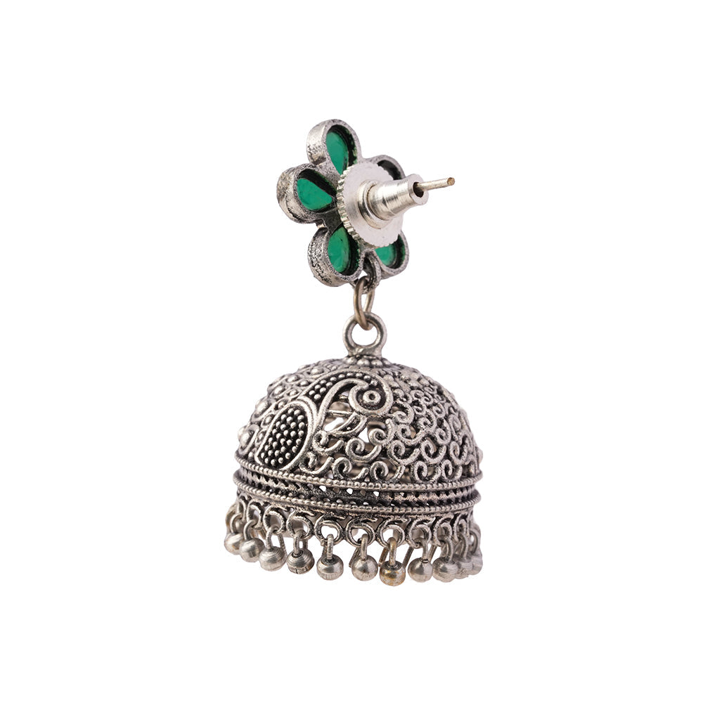 Champika- Silver Brass Stone-Studded Jhumka Earrings(Green)