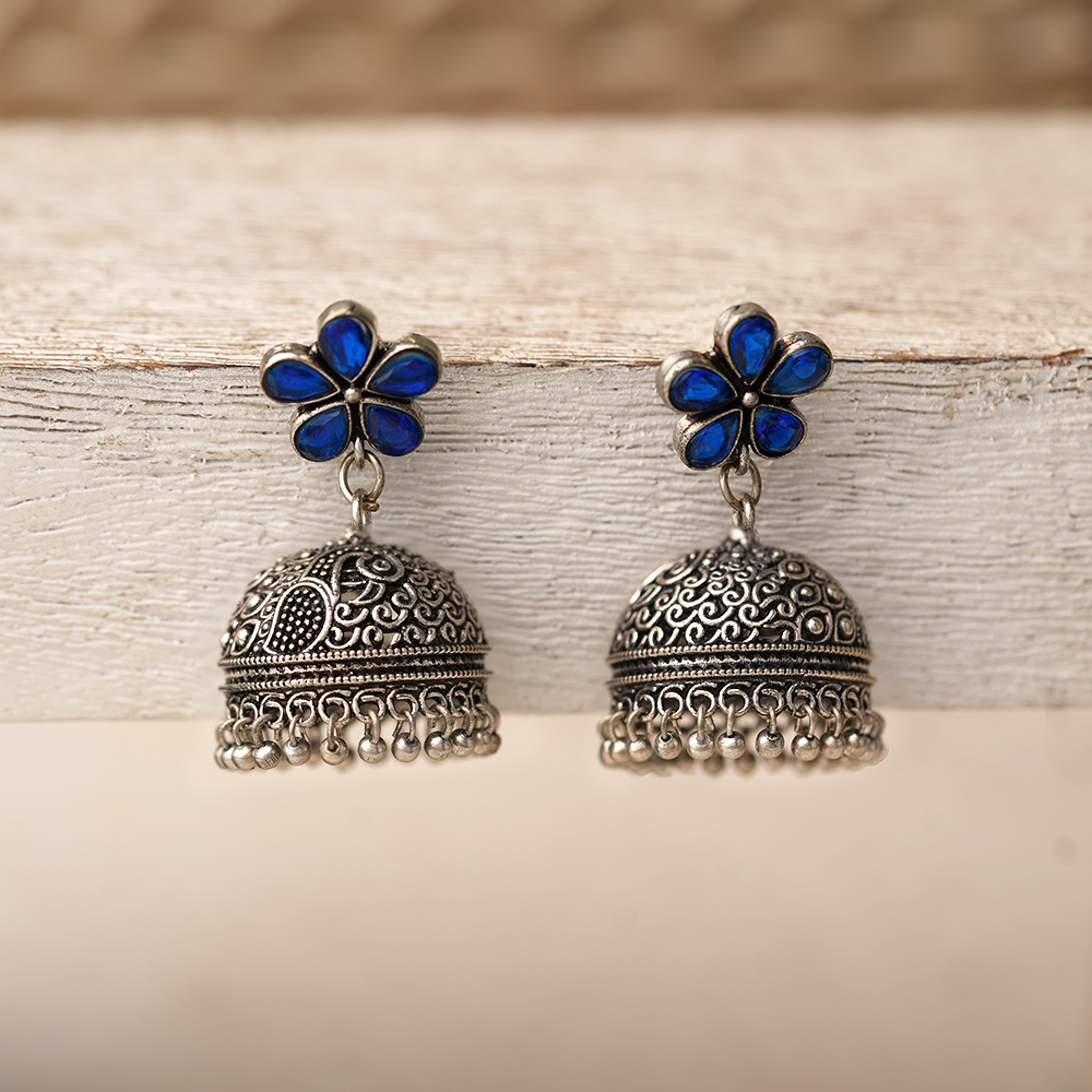 Champika- Silver Brass Stone-Studded Jhumka Earrings(Blue)