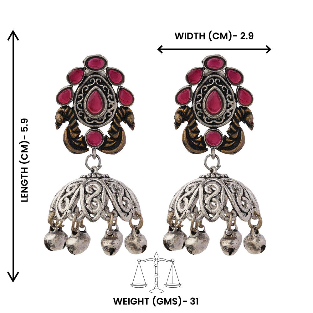 Kusumeyura- Silver Brass Stone-Studded Jhumka Earrings(Red)