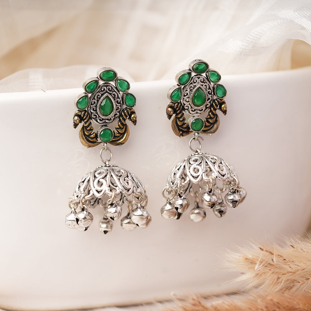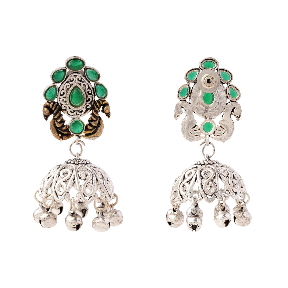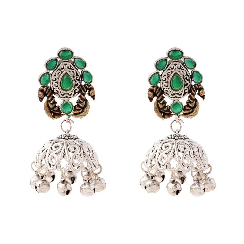 Kusumeyura- Silver Brass Stone-Studded Jhumka Earrings(Green)