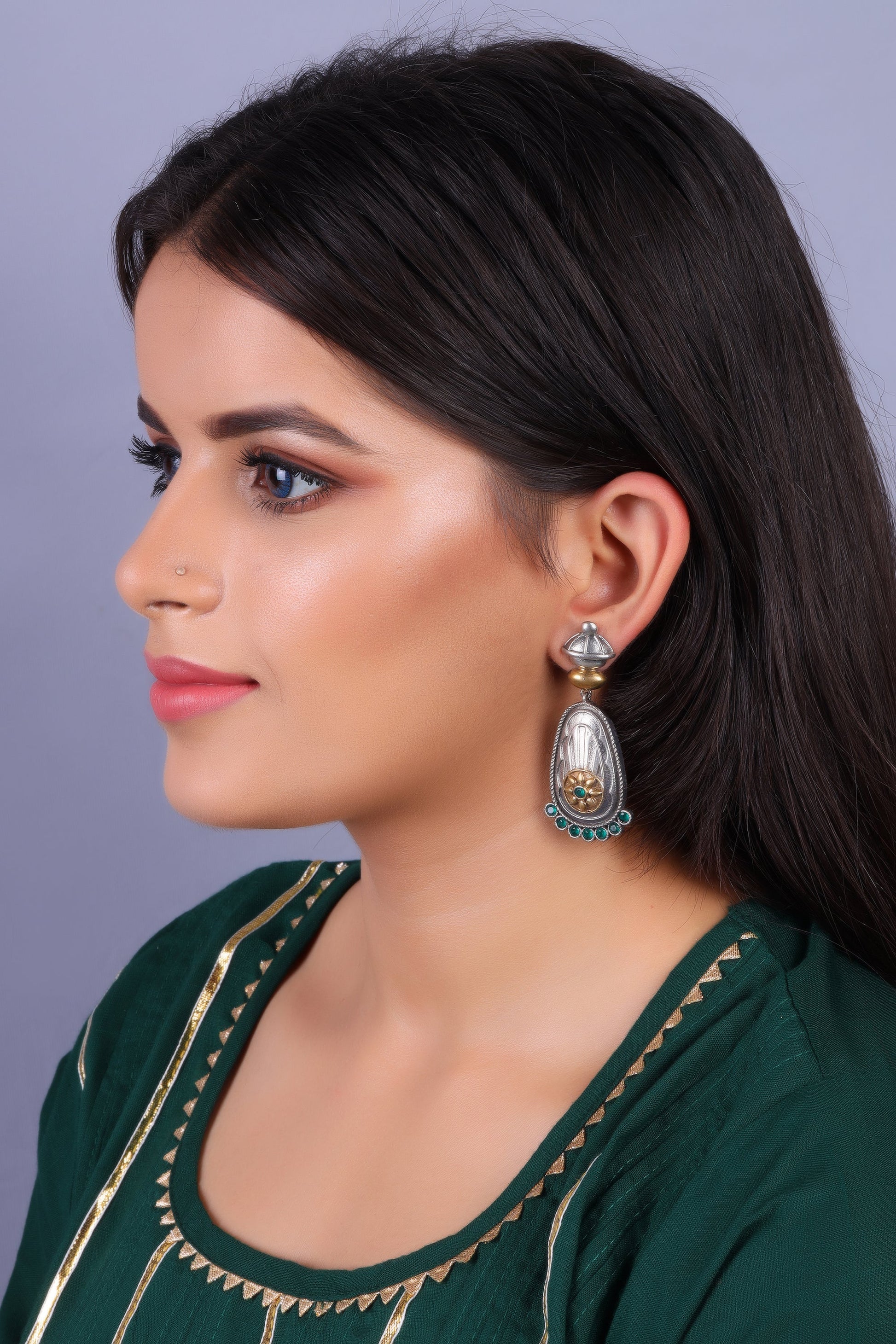 Experience a blend of tradition and elegance with our Rangaabha oxidised dangler earrings. Crafted from silver-finish brass, these earrings feature striking green stones and detailed motifs that add cultural charm to any outfit. Lightweight and bold, they’re perfect for festive occasions, parties, and statement looks.
