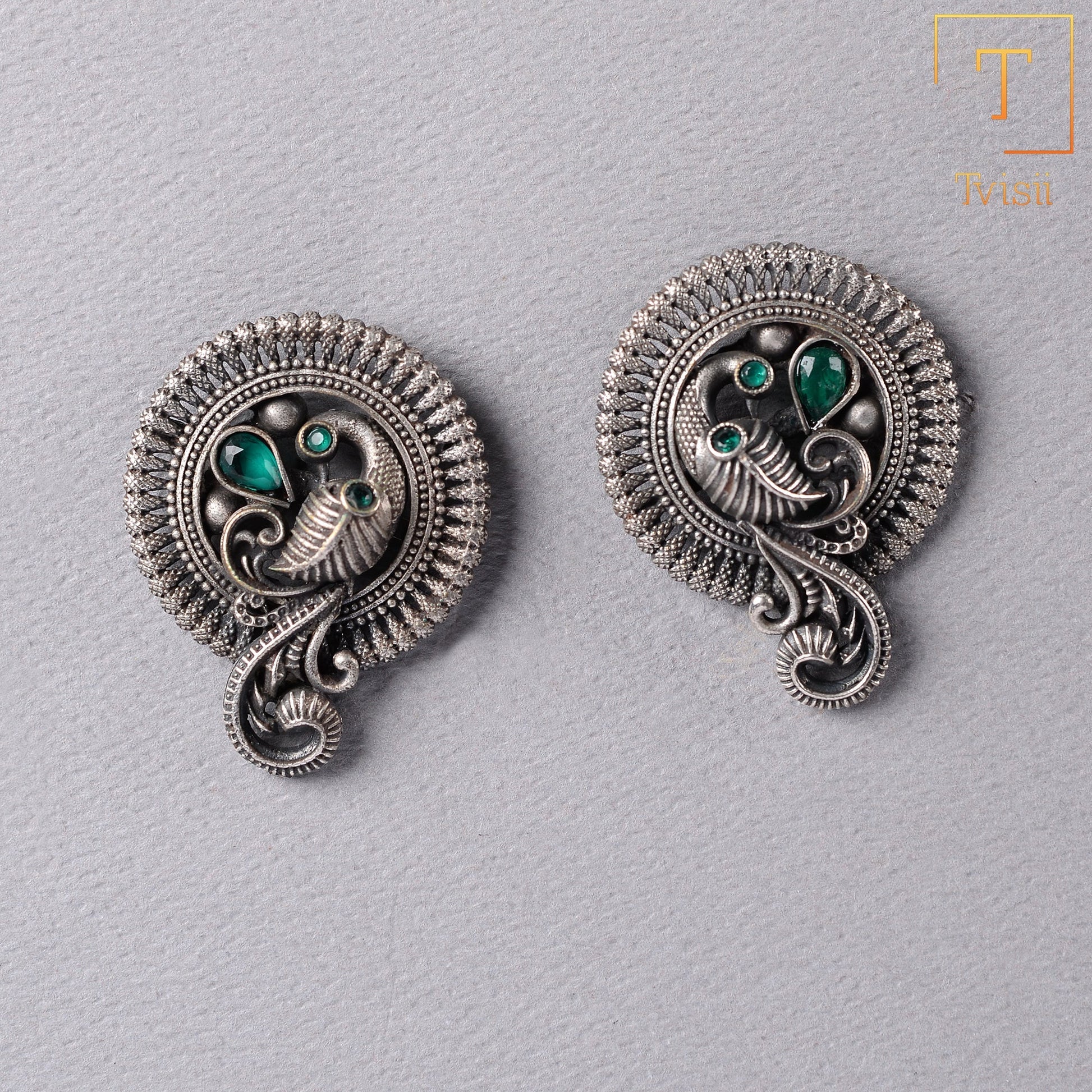 MorRatna- Silver Brass Stone Studded Stud Earrings(Green)