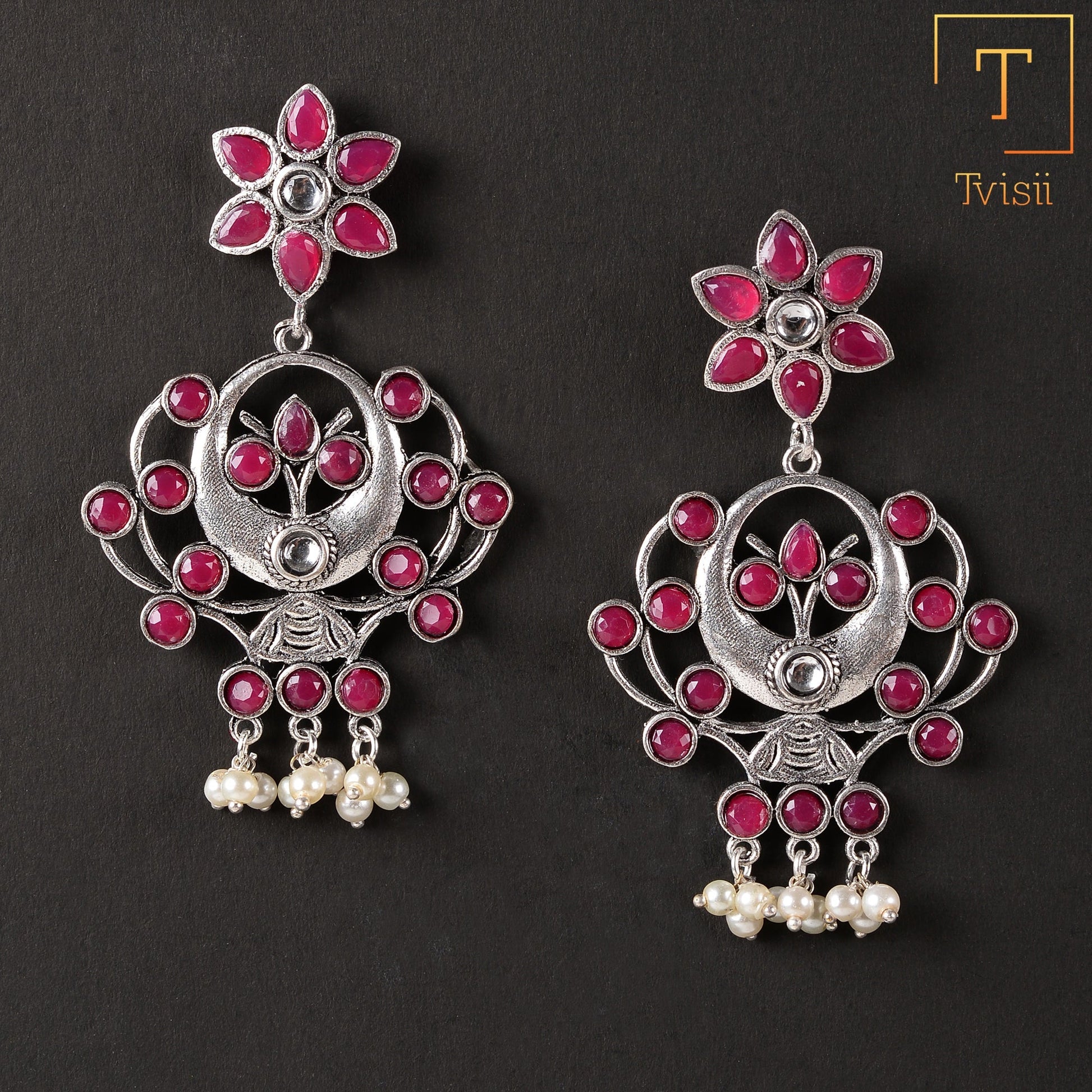 Dhaval- Silver Brass Oxidised dangler earrings(Red)