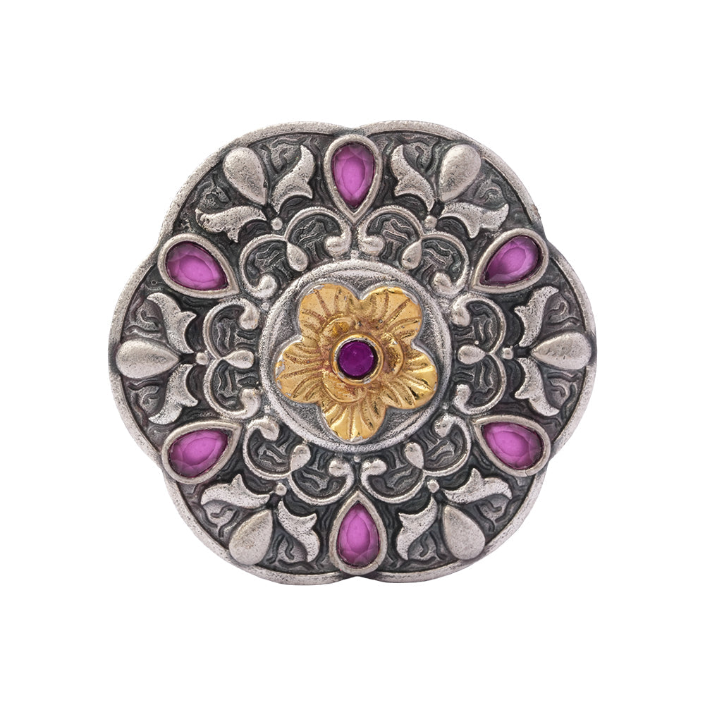 Add a touch of ethnic elegance to your look with the Vasanti oxidised ring. Designed with intricate detailing and a striking central red stone, this ring beautifully blends vintage aesthetics with modern versatility. The oxidised silver finish enhances its handcrafted appeal, while the adjustable brass band ensures a secure and comfortable fit. A perfect statement accessory for festive occasions, parties, or everyday elevated styling.