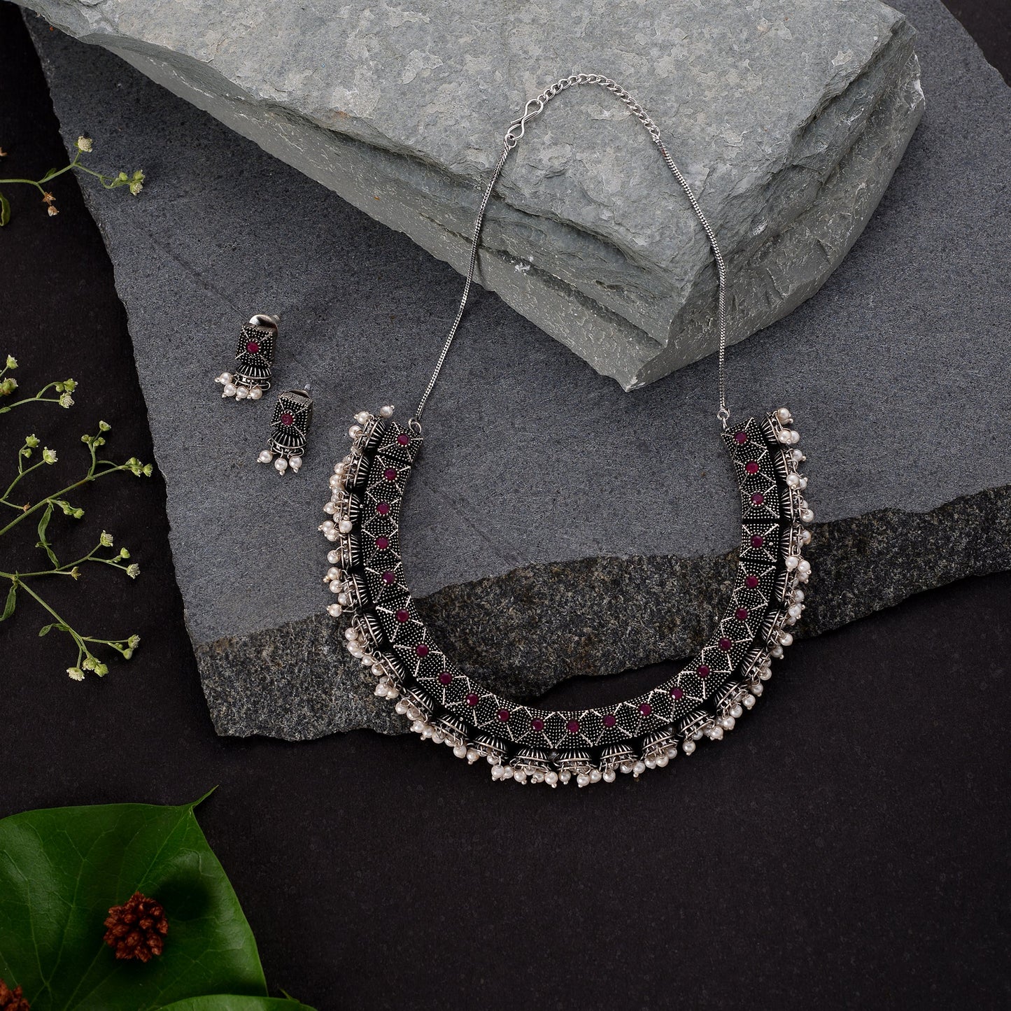 Discover timeless beauty with our oxidised necklace set. Featuring oxidised finish and intricate patterns, it offers elegance and sophistication for every occasion.