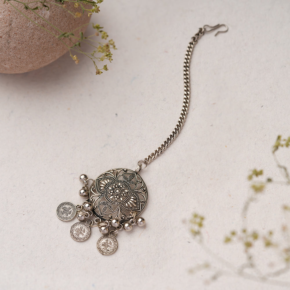 Elevate your traditional look with the Phooltikka Mangtikka. Designed in a classic silver finish, its floral-inspired motif adds a delicate charm to your forehead, making it the perfect accessory for festive occasions, ethnic celebrations, and wedding functions. Lightweight and elegantly crafted, this piece effortlessly enhances your ensemble without overpowering it.