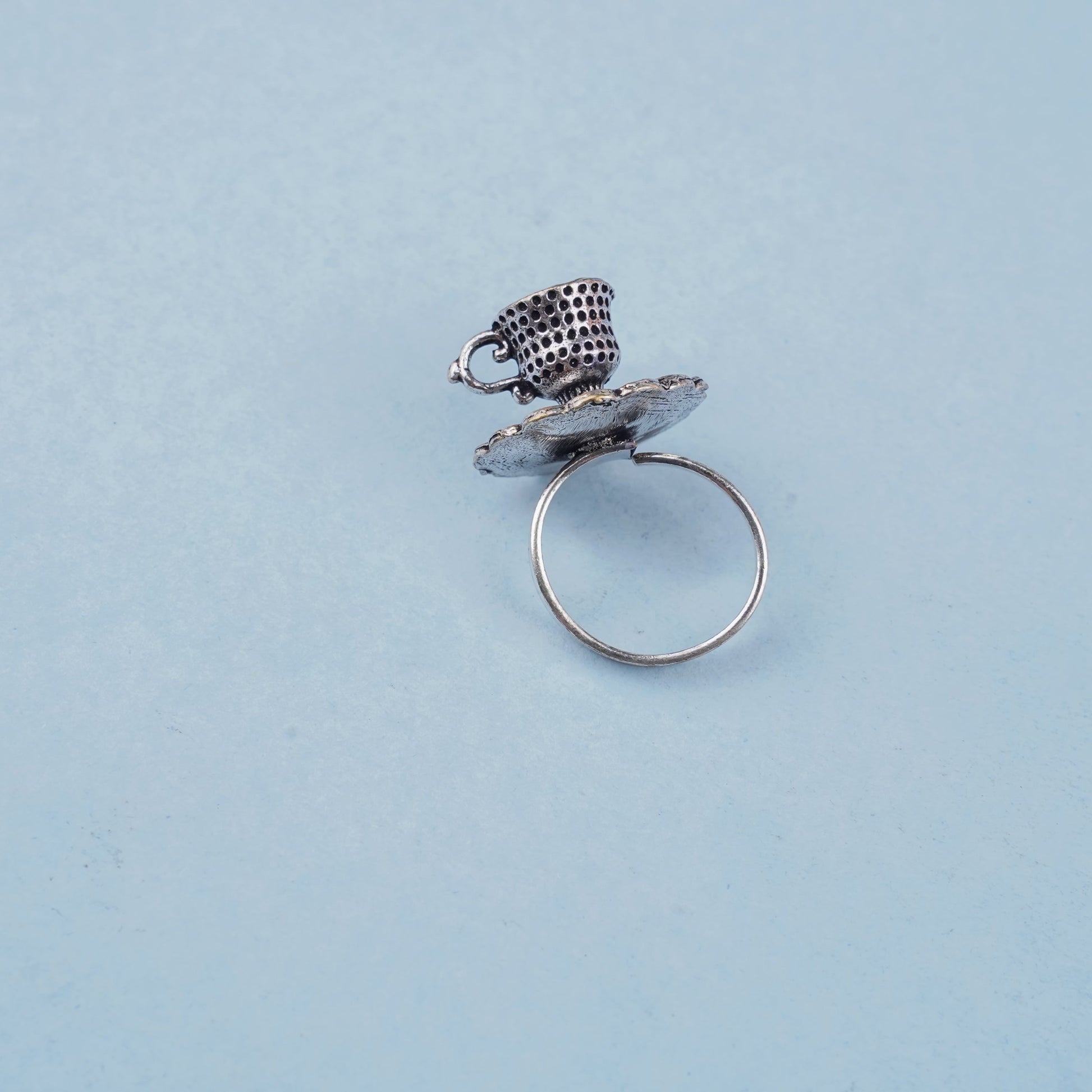 Add a playful twist to your accessory collection with the Piyali oxidised ring. Designed in brass with an antique silver finish, it features an adorable teacup-and-saucer motif that showcases intricate craftsmanship. Lightweight, comfortable, and adjustable, this charming piece effortlessly blends vintage aesthetics with everyday elegance.